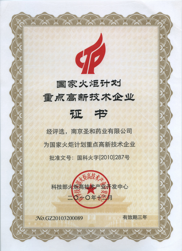2010國家火炬計(jì)劃重點(diǎn)高新技術(shù)企業(yè)證書