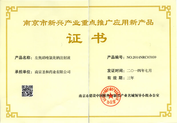 2014南京市新興產(chǎn)業(yè)重點(diǎn)推廣應(yīng)用新產(chǎn)品證書
