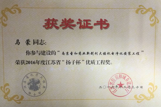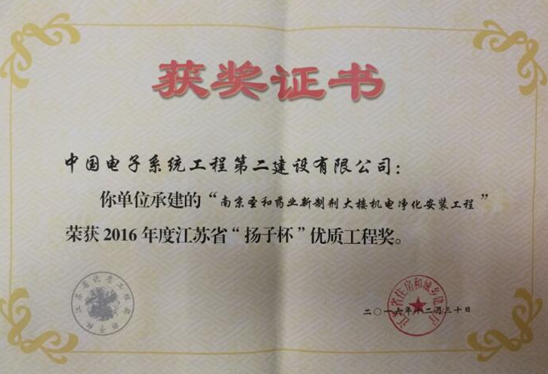 在車間正常生產(chǎn)的同時(shí),由中國(guó)電子系統(tǒng)工程第二建設(shè)有限公司承建的兩個(gè)抗癌車間喜獲2016年度江蘇省“揚(yáng)子杯”優(yōu)質(zhì)工程獎(jiǎng)。“揚(yáng)子杯”是江蘇省內(nèi)建筑工程質(zhì)量最高榮譽(yù)獎(jiǎng),由江蘇省建設(shè)廳、江蘇省建筑工程管理局、江蘇省建筑行業(yè)協(xié)會(huì)組織評(píng)選。據(jù)悉,2016年度江蘇省優(yōu)質(zhì)工程獎(jiǎng)“揚(yáng)子杯”表彰總數(shù)不超過(guò)450項(xiàng),其中安裝專業(yè)工程表彰數(shù)不超過(guò)55項(xiàng),通過(guò)評(píng)審的難度非常大。該獎(jiǎng)項(xiàng)的獲得體現(xiàn)了公司項(xiàng)目施工管理的水平,是中國(guó)電子系統(tǒng)工程第二建設(shè)有限公司為我公司遞交的一份滿意答卷,也是我公司新制劑大樓項(xiàng)目中所有成員辛勤努力工作的結(jié)果和共同榮譽(yù),它完美詮釋和體現(xiàn)了公司團(tuán)隊(duì)合作、績(jī)效為先的核心價(jià)值觀。