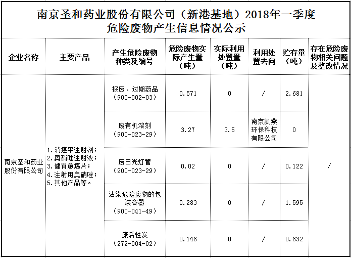 南京圣和藥業(yè)股份有限公司(新港基地)2018年一季度危險(xiǎn)廢物產(chǎn)生信息情況公示