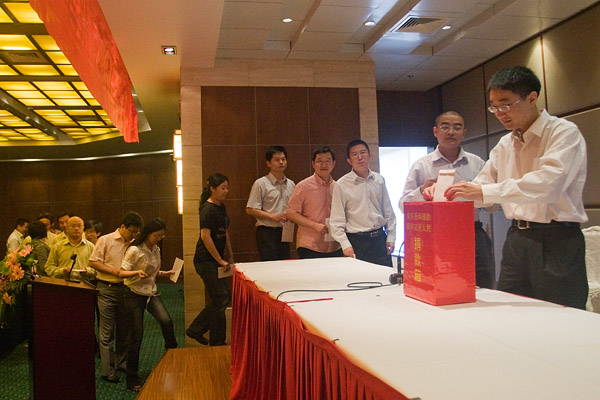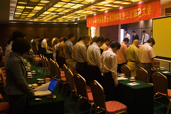 圖為公司員工會(huì)議之前集體為四川災(zāi)區(qū)遇難同胞默哀