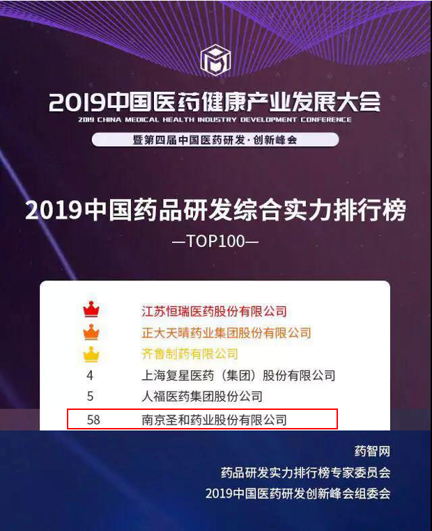 2019年6月21日,“2019中國醫(yī)藥健康產(chǎn)業(yè)發(fā)展大會暨第四屆中國醫(yī)藥研發(fā)?創(chuàng)新峰會”(PDI大會)于重慶國際會議展覽中心(南坪)耀世啟幕。大會隆重揭曉了《2019中國藥品研發(fā)實力排行榜》系列榜單,其中最受矚目的《2019中國藥品研發(fā)綜合實力排行榜 TOP100》和《2019中國化藥研發(fā)實力排行榜 TOP100》各有百家創(chuàng)新型企業(yè)代表入圍,圣和藥業(yè)同時入圍這兩個榜單,分別位列第58名和第24名。