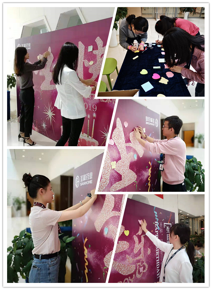 當天中午,麒麟總部負一層中庭處,小伙伴們將自己對圣和的祝福用文字表達在幾年展板上,五顏六色的彩貼、深情暖心的字句體現(xiàn)了圣和人對公司的美好祝愿,在笑容中合影留念,記錄下這美好瞬間。