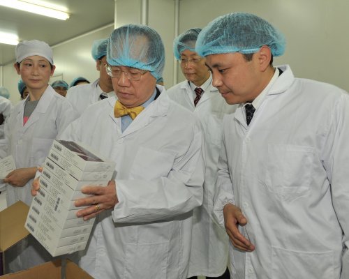 隨后,曾蔭權(quán)行政長官一行在王勇董事長的陪同下先后參觀了研究院、生產(chǎn)車間、質(zhì)量控制中心和全自化立體高架庫,了解了公司的主打產(chǎn)品、質(zhì)控執(zhí)行和自動化應(yīng)用等情況。