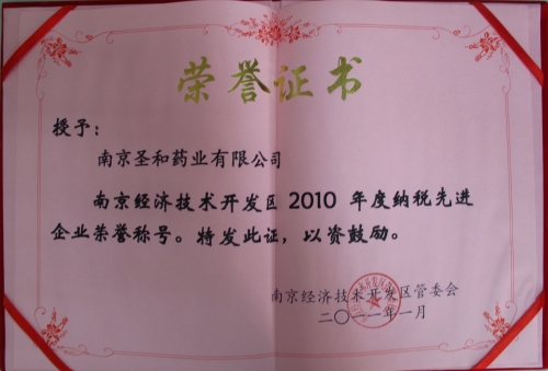 2011年1月24日,南京經(jīng)濟技術開發(fā)區(qū)管委會召開了2010年度納稅表彰大會,對區(qū)內在2010年度為開發(fā)區(qū)經(jīng)濟發(fā)展和稅收方面做出重要貢獻的企業(yè)進行表彰。我司在此次評選中獲“納稅先進企業(yè)”稱號。