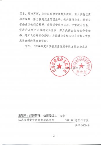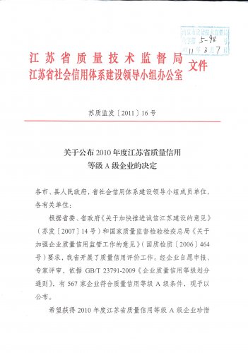 在規(guī)劃發(fā)展部和質(zhì)量部的共同努力下,我公司被江蘇省質(zhì)量技術(shù)監(jiān)督局、江蘇省社會(huì)信用體系建設(shè)領(lǐng)導(dǎo)小組評(píng)為《2010年度江蘇省質(zhì)量信用等級(jí)A級(jí)企業(yè)》。該榮譽(yù)將在企業(yè)名牌產(chǎn)品認(rèn)定、許可證監(jiān)管、投資項(xiàng)目核準(zhǔn)、債券發(fā)行審批、財(cái)政資金審核分配和出口產(chǎn)品通關(guān)等環(huán)節(jié)中發(fā)揮得到廣泛應(yīng)用,對(duì)公司的誠(chéng)信體系建設(shè)具有重要的意義,是對(duì)公司核心競(jìng)爭(zhēng)力的肯定,進(jìn)一步提高了公司的綜合信用等級(jí),提升了品牌形象。