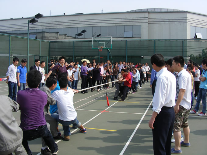 4月28日下午,位于制藥廠內(nèi)的籃球場上人聲鼎沸、熱鬧非凡,參加拔河比賽參賽隊(duì)員、啦啦隊(duì)員及工作人員早早來到了場地。15點(diǎn)整,隨著裁判的哨聲一響,參賽隊(duì)員都全身心地投入到比賽中去。隊(duì)員們緊緊抓牢手中的繩子,降低重心,齊心協(xié)力,卯足了勁往后拉。每名隊(duì)員都是竭盡全力,摔倒了,再爬起來,手磨破了,咬咬牙繼續(xù)堅(jiān)持著。“加油!加油!”場邊拉拉隊(duì)員們的加油聲、歡呼聲響徹整個(gè)籃球場的上空,此起彼伏,現(xiàn)場氣氛十分熱烈。