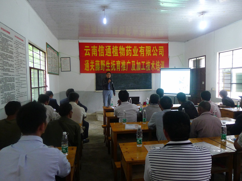 會議由生產(chǎn)技術(shù)部經(jīng)理王平理主持。會上,植物藥業(yè)副總經(jīng)理孫新平向與會人員介紹了公司情況及發(fā)展規(guī)劃;馬關(guān)縣科協(xié)主席發(fā)表講話,對培訓(xùn)會給予高度評價,號召農(nóng)戶與公司積極配合,做到互惠互利,合作共贏。隨后,生產(chǎn)技術(shù)部高級技術(shù)員趙光榮就通關(guān)藤的種苗移栽和采收方法向大家進(jìn)行了圖文并茂地講解。在現(xiàn)場,對農(nóng)戶最關(guān)心的問題進(jìn)行說明和交流,解答了農(nóng)戶的疑問;通過有獎競答,向參會人員送出了印有公司標(biāo)志的禮品,讓廣大農(nóng)戶對通關(guān)藤種苗移栽和采收方法的細(xì)節(jié)爛熟于心,保證了培訓(xùn)效果。
